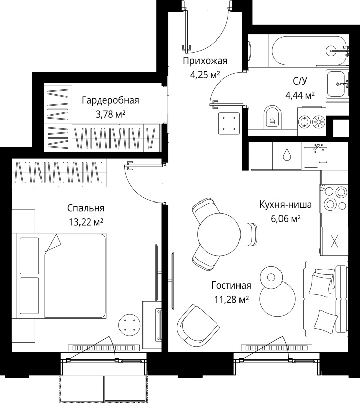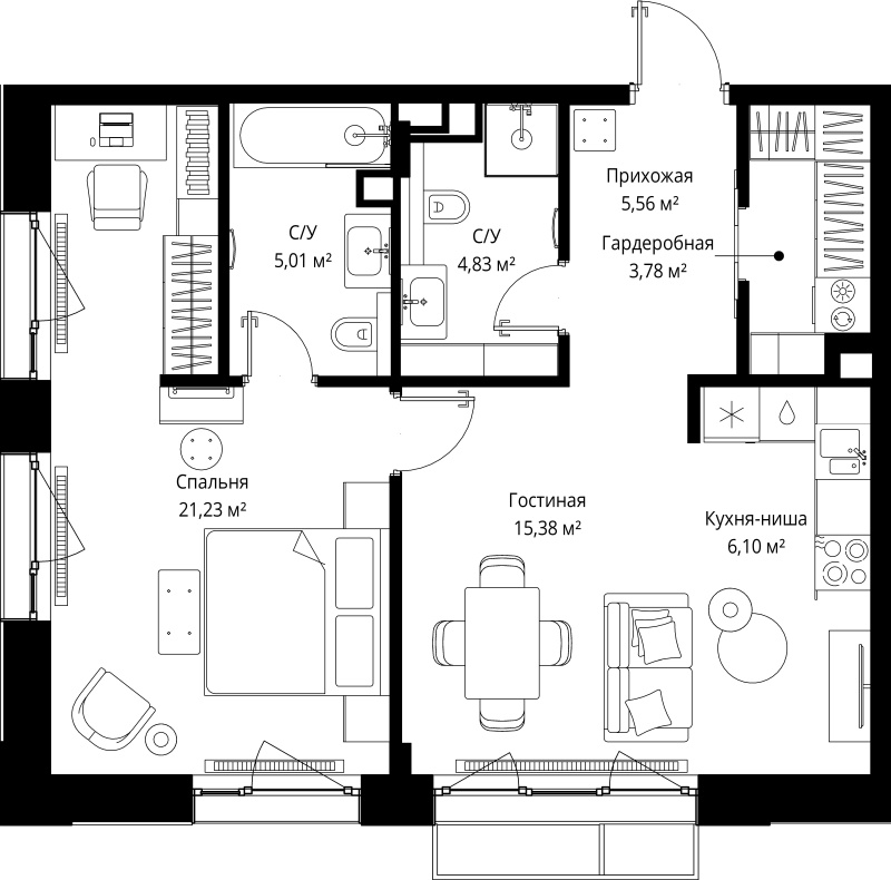 - Высота окон - 2.2 м;